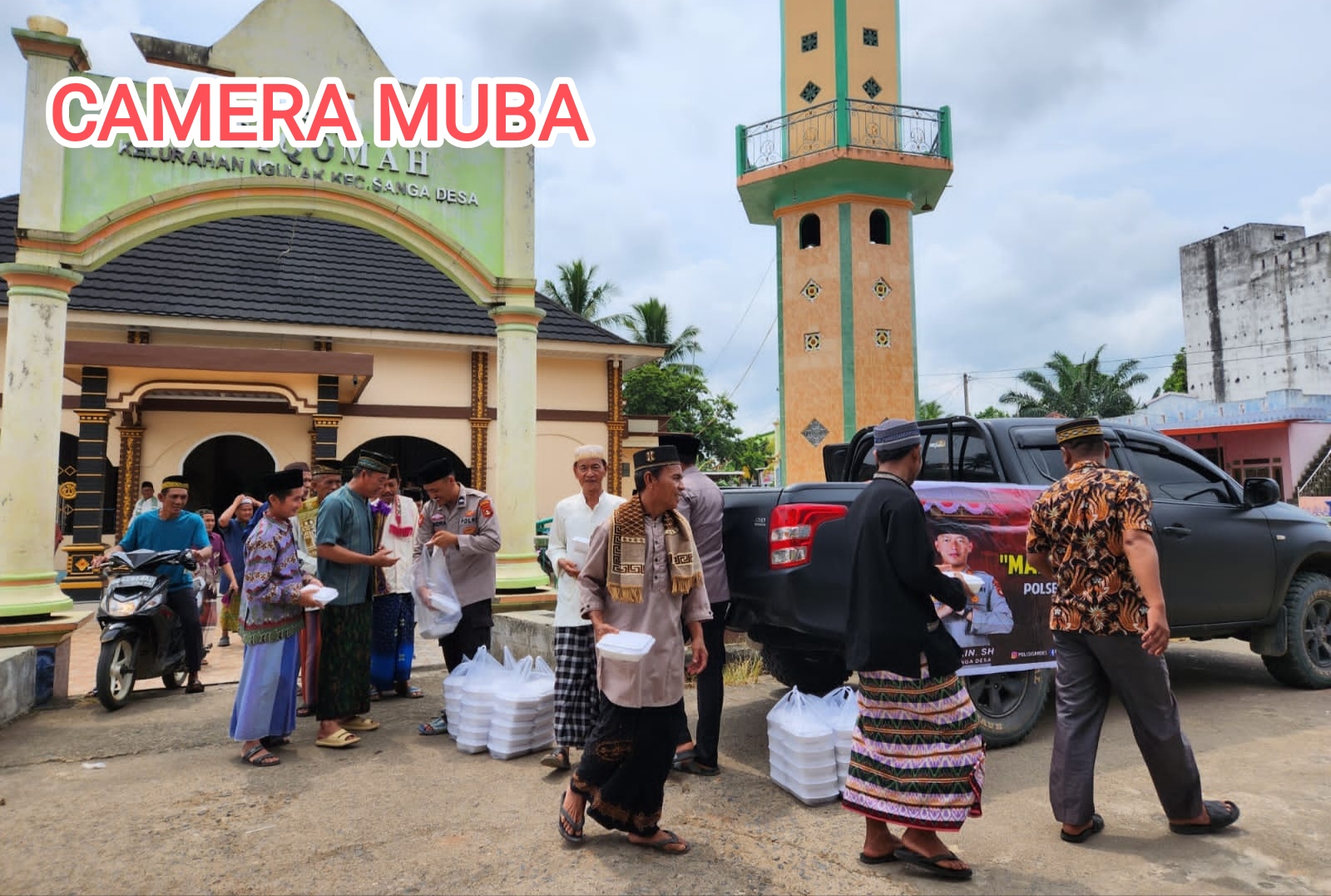 SANGA DESA, CAM- Jumat berkah jajaran Polsek Sanga Desa Resort Musi Banyuasin bagikan ratusan nasi kotak kepada jamaah Masjid Istiqomah Kelurahan Ngulak, Kecamatan Sanga Desa, usai melaksanakan ibadah rutin Salat Jumat berjamaah, Jumat 15 Desember 2023.